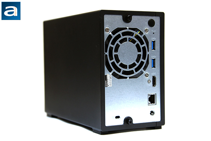The ASUSTOR AS3102T is constructed on a steel frame, while its shell that covers the remainder of the sides of the system is composed of black plastic. The textured plastic is reasonably resistant to fingerprints and scratches. What we have at the back of the system is an extremely simple array of connectors. Here, we have a power button, reset pinhole, two USB 3.0 ports, HDMI 1.4b connector, Gigabit Ethernet port, and a DC 12V input from the external power brick. There is also a Kensington lock at the bottom left corner. Occupying a large chunk of space at the back is a single 70mm exhaust fan to pull heat out of your NAS server. Exhaust vents are cut into the steel panel. In my opinion, a proper fan grille would have been better, but this should not affect cooling performance to a significant degree.