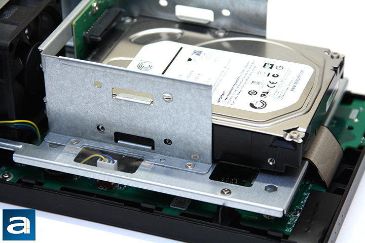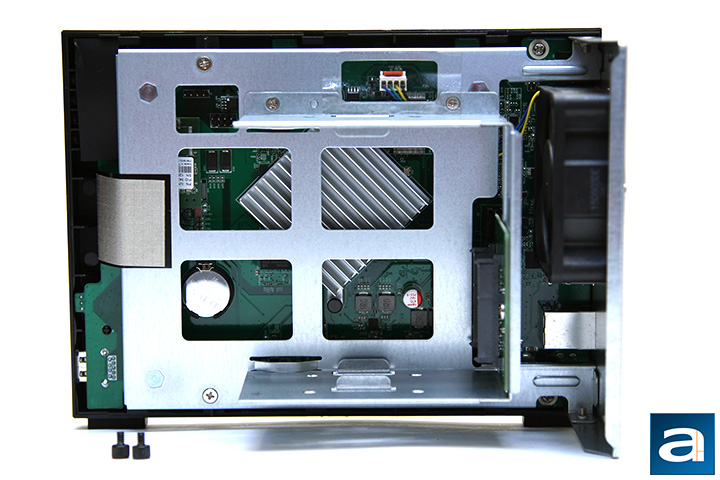 There is no wasted room inside the ASUSTOR AS3102T network attached storage. We can see two 3.5" drive bays occupying majority of the area, as well as the 70mm fan at the back. A centimeters or so of clearance room can be seen between the rear fan and the two hard drive bays. This allows some space between components to reduce heat congestion. Its well-placed rear exhaust fan can then easily take out the warm air, and allow cooler air to flow over the mounted hard drives with minimal turbulence noise. A mid-sized passive heatsink is used to keep the processor running cool. The motherboard is mounted with its components facing inwards to take advantage of the airflow generated by the sole rear fan as well. Generally speaking, it is pretty packed inside the ASUSTOR AS3102T, but everything is neatly placed and cabled to maximize cooling efficiency.