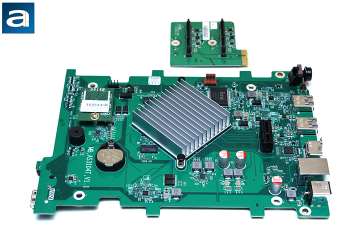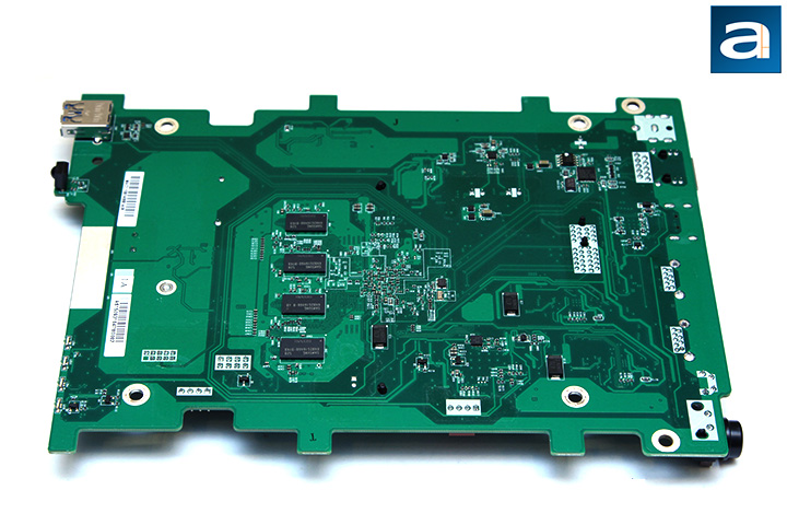 Flipping the green motherboard around, and we can see more integrated circuits surface mounted at the back. Since the ASUSTOR AS3102T is a fairly barebones NAS, and the Intel SoC already has most of the features integrated, there is nothing of particular interest here other than four of the eight Samsung memory chips as aforementioned. According to the silkscreen on the printed circuit board, this is the same one used in the four bay AS3104T network attached storage system. Otherwise, everything component is soldered on directly to the motherboard; ASUSTOR does not intend the user to upgrade anything directly related to the system.