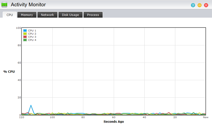 Another useful application found on the ASUSTOR AS3202T is the Activity Monitor application, which is used to keep track of the load on the NAS device. There are a total of five tabs here that tracks different things, including CPU, Memory, Network, Disk Usage, and Process. All of these combined give a good look at the performance of the device at any given time from utilization. The first tab keeps track of CPU usage from CPU 1 to CPU 4 (Remember, quad core), and all of them are listed on a dynamically updating line graph. In Memory, the usage of memory in percentage is kept track of with a line graph as well. The bottom features a bar graph with the total amount of physical memory, amount of memory used, and the amount of memory available. Network usage keeps track of the network usage in sent and received from the LAN port. Disk Usage has a pie graph that shows the amount of space being used, amount free, and other applications that may be using the disk. Lastly, Process lists the number of processes running on the NAS, as well as the memory usage and the CPU usage of each process.