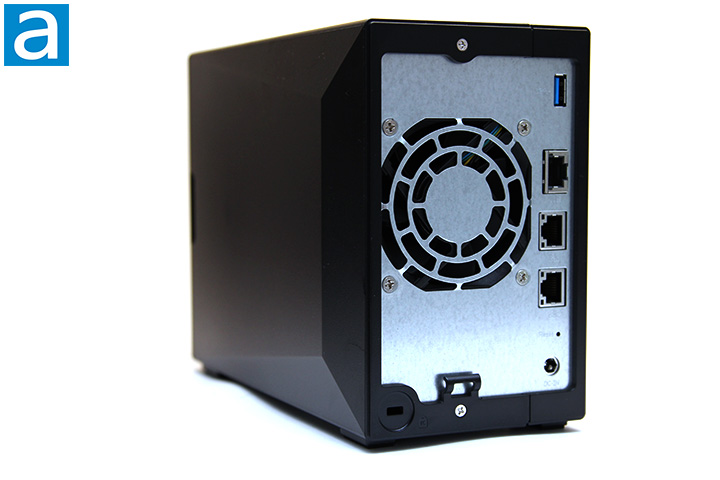 The ASUSTOR AS4002T is constructed on a steel frame, while its shell that covers the remainder of the sides of the system is composed of black plastic. The textured plastic is reasonably resistant to fingerprints and scratches. What we have at the back of the system is an extremely simple array of connectors. Here, we have a USB 3.1 port, 10GbE port, two Gigabit Ethernet ports, reset pinhole, and a DC 12V input from the external power brick. There is also a Kensington lock at the bottom left corner. Occupying a large chunk of space at the back is a single 70mm exhaust fan to pull heat out of your NAS server. Exhaust vents are cut into the steel panel. In my opinion, a proper fan grille would have been better, but this should not affect cooling performance to a significant degree.