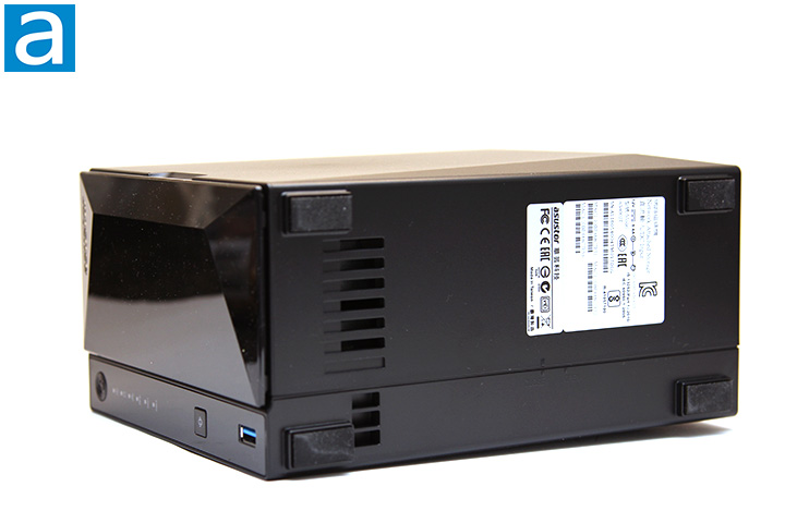 The ASUSTOR AS4002T's external design is an implementation of the company's latest network attached storage system design scheme, which is an evolutionary update to the AS3202T and its predecessors. The AS4002T has an attractive diamond-cut exterior with a magnetically attached hexagonal plastic front cover. Even though the AS4002T is not meant to be a home entertainment device -- there is no HDMI port -- it does not hurt to have something that looks good in any room. The good news is it will not look out of place in an industrial setting either. The only thing I do not like about glossy black finishes is that they are incredibly fingerprint and swirl prone. That said, while the cover design is a departure from mainstream systems, there is nothing too radical at heart -- and this is a good thing. This is still a two-bay device in its traditional form factor. Measuring in at 11.4cm wide, 23.0cm deep, and 17.0cm tall according to specifications, these figures are nearly identical to other dual bay NAS systems from ASUSTOR. Like every consumer grade network attached storage system we have reviewed in the past, the ASUSTOR AS4002T features an external power brick; we will cover that in detail in just a moment. The advantage of this is that a heat source is placed outside the system for improved thermal efficiency.