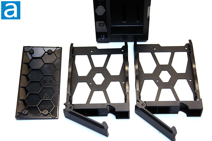 One of the biggest improvements with the AS4002T are its removable front-loaded drive trays -- something ASUSTOR was unable to do with the AS3202T and other devices based on the same chassis. In order to access the removable front-loaded drive trays, simply pull the magnetic front cover off. The lack of ventilation slots on the front cover means cooling performance will be affected slightly. For the current design, airflow is over the hard drives driven by the rear mounted cooling fan inside the system and enters the NAS through ventilation slots at the bottom; more on this later.