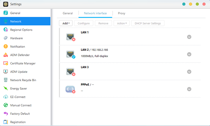 Given all the above icons we could look at, the first one I decided to examine was the Settings icon, since this is probably the most important part of the software due to what a NAS is used for. When we first open it up, we are given a whole slew of options on the left to choose from. From top to bottom, these are General, Network, Regional Options, Hardware, Notification, ADM Defender, Certificate Manager, ADM Update, Network Recycle Bin, Energy Saver, EZ-Connect, Manual Connect, Factory Default, and Registration. Most of these options are quite self-explanatory; we will just pick a few of the unique ones to take a deeper look at them.
