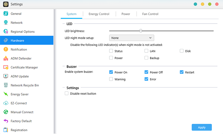 Secondly, we will take a look at the Hardware tab, as that is where we are able to control the majority of the hardware behind the ASUSTOR AS4002T. There are four tabs here, starting from left to right we have System, Energy Control, Power, and Fan Control. The System tab gives the user to control the lights and sounds coming from the NAS itself. The LEDs can be turned on and off, and the brightness of the LED indicators can be set as well. It is also possible to disable the buzzer or system sounds from being heard. The reset button can also be disabled to prevent accidental resets. Under the Energy Control tab, the time before a drive goes into standby can be set. In case your NAS HDDs cannot enter standby, a diagnostic tool was made to see which process is preventing it from doing so. The Power tab has a few settings to reduce the power usage on the AS4002T, including EuP mode and power scheduling. When it comes to Fan Control, there are four settings: Auto, Low speed, Medium speed, and High speed. All of these can be found under the Hardware tab on the left side and are pretty standard when it comes to options you would want to see on a NAS device.