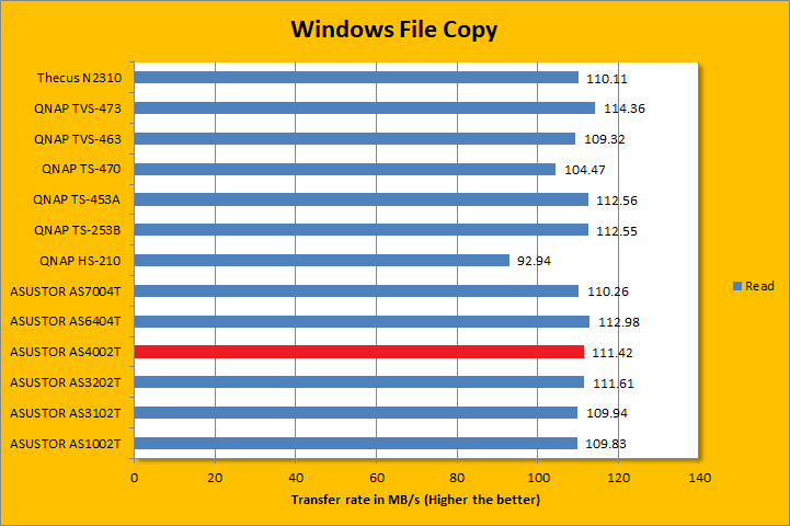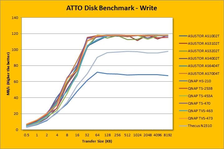 ATTO disk benchmark provides valuable insight into evaluating disk performance; it is especially valuable since it is not local disk limited like Windows file copy but rather the network adapter itself. After first using it in our QNAP TS-559 Pro+ review countless years ago, ATTO has been an integral part of our storage benchmarks; used in everything ranging from USB flash drives to solid state disks. Venturing into the area of 118.697MB/s in read and 117.993MB/s write for pretty much everything 64K and up, remember the theoretical maximum of Gigabit Ethernet is 125MB/s (1000Mbps / 8) with overhead -- this is about as fast as it gets. Under the curve, it was slightly slower to pick up that high-power systems like the QNAP TVS-473 and even the company's own low power AS3202T, but the gap was not considerable. At peak, the AS4002T was limited only by the Gigabit network interface and not the performance of the NAS itself. The ASUSTOR delivered performance well in line with the competition for standard workloads, and we expect even better performance on 10GbE networks.