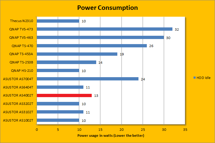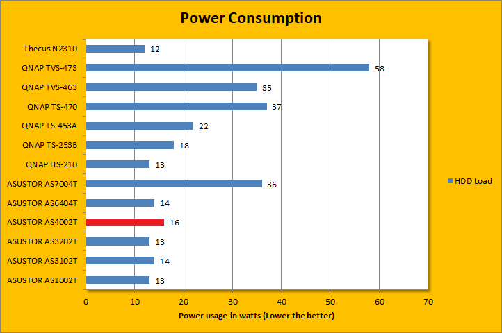 With one Seagate NAS hard drive installed, power consumption for our specific configuration was at a reasonable 13W idling and 16W under load. These figures were a bit higher than the ASUSTOR AS6404T and AS3202T on both counts, systems with more powerful Intel Celeron quad core SoC compared to the AS4002T, respectively, which was surprising. Considering the performance class of this device, this is acceptable, but not impressive. Power consumption will drop if the hard drives are configured to turn off if they are not used. Considering it is going to be running 24/7, every watt adds up.