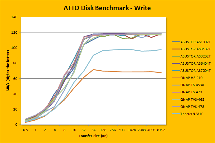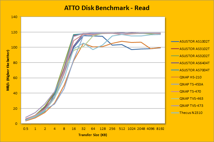 ATTO disk benchmark provides valuable insight into evaluating disk performance; it is especially valuable since it is not local disk limited like Windows file copy -- but rather the network adapter itself. After first using it in our QNAP TS-559 Pro+ review countless years ago, ATTO has been an integral part of our storage benchmarks; used in everything ranging from USB flash drives to solid state disks. Venturing into the area of 119.040MB/s in read and 118.253MB/s write for pretty much everything 64K and up, remember the theoretical maximum of Gigabit Ethernet is 125MB/s (1000Mbps / 8) with overhead -- this is about as fast as it gets. Under the curve, it was slightly slower to pick up that high power systems like the QNAP TVS-473 and even the company's own low power AS3202T, but the gap was not considerable. At peak, the AS6404T was limited only by the network interface and not the performance of the NAS itself. The ASUSTOR delivered performance well in line with the competition for standard workloads.
