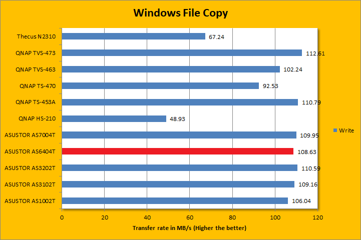 Equipped with the Seagate NAS HDD ST4000VN000 4TB, our ASUSTOR AS6404T was ready to roll. From our experience in benchmarking, Intel Gigabit LAN adapters -- at least on the client side -- typically perform better than their Realtek and Marvell counterparts. Therefore, to prevent any bottlenecks on the client side, our Gigabyte GA-Z97X-UD3H-BK motherboard was connected to the network via its integrated Intel Gigabit LAN adapter. We also conducted the tests on our OCZ Vector 180 240GB solid state drive on the client side to ensure there is nothing limiting the performance of our ASUSTOR AS6404T than the NAS itself. The results were within our expectations, which was excellent. As you can see in our graphs above, the ASUSTOR AS6404T was capable of doing 108.63MB/s for write and 112.98MB/s for read using the Seagate NAS HDD. At this point, the bandwidth of Gigabit LAN is the limitation.