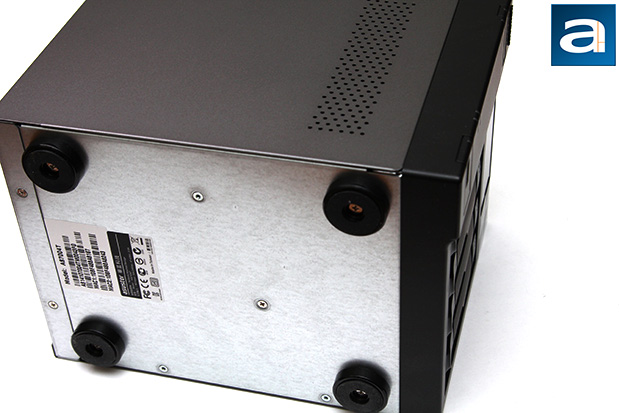 There is nothing particularly exciting at the bottom of the ASUSTOR AS7004T's chassis; what you will see here are four large legs affixed on top of its steel frame panel. As always, they are installed to reduce vibration noise, increase grip, and prevent surface scratching. The left side of the network attached storage system features a neat array of small openings on its metal shell. It is placed right next to where the motherboard is inside, to make sure hot air does not get congested within.