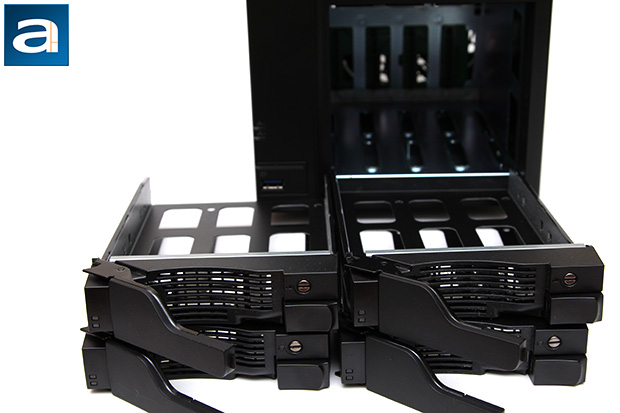 While the ASUSTOR AS7004T is constructed on a steel frame, its shell that covers three sides of the system is composed of SECC in gunmetal gray. It looks pretty good in my opinion, but it is nothing we have not seen before -- QNAP implements almost the exact same design in their products. For most business users, the NAS will be placed in a room where no one will bother spending time admiring your equipment. But for others, this may end up being in their living room, so appearance is important, although I still do not think the AS7004T will blend in too well with your home theater receiver and Blu-ray player. Do not get me wrong. It is not necessarily unfitting, but you can definitely do better.
