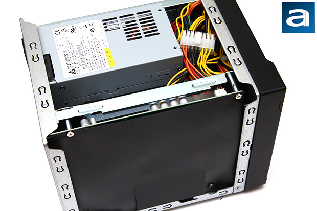 There is no wasted room inside the ASUSTOR AS7004T network attached storage. Actually, if you have seen any of our business class four bay NAS reviews from QNAP since 2009, the ASUSTOR is practically identical. It is built nearly the exact same way as QNAP boxes like the TS-470, from the way components are mounted to the way panels are interlocked. We can see the LCD controller module at the front, its four 3.5" drive bays occupying majority of the area, as well as the power supply located right above the drive bays. A few centimeters of clearance room can be seen between the rear 120mm fan and the hard drive bays. This allows some space between components to reduce heat congestion. Its well placed rear exhaust fan can then easily take out the warm air, and allow cooler air to flow over the mounted hard drives with minimal turbulence noise. A tower heatsink with heatpipes connected to the CPU is placed between the fan and the hard drive bays to cool the processor. The motherboard is mounted with its components facing inwards to take advantage of the airflow generated by the sole rear fan as well, with the entire back covered by a piece of black plastic, just in case anything makes contact with the shell and short circuits. Generally speaking, it is pretty packed inside the ASUSTOR AS7004T, but everything is neatly placed and cabled to maximize cooling efficiency.