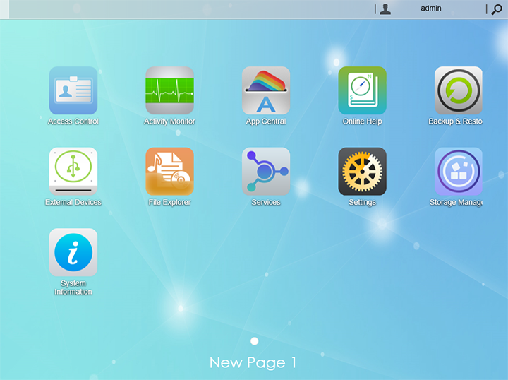 By default, there are thirteen buttons. Listed from top to bottom and left to right, they are Access Control, Activity Monitor, App Central, Online Help, Backup & Restore, External Devices, File Explorer, Services, Settings, Storage Manager, and System Information. More will appear, depending on the applications you install. Each of these buttons will launch a small pop-up AJAX designed window when clicked that gives additional features or options to setup their NAS. These individual pop-ups are gray in color, and also look quite modern. We can attest to the fact the ADM system does look advanced and sleek, while being simple to use at the same time. At the bottom of the page, where it displays "New Page 1", it can be changed to any text that the user wants, and adds a small layer of customization to the front page. The top bar is also used as a taskbar as well. Any applications you run are added to the top bar next to the "Show Desktop" button at the very end.
