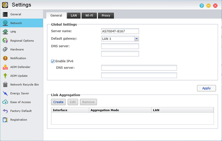 The first one we will look into is the Network tab, as the options here are quite important. In the Network tab, there are three other options at the top, these are General, LAN, Wi-Fi, and Proxy. The General option allows the user to set the server name, default gateway, DNS server, and the option to enable IPv6. There is also a spot to create link aggregation if desired. The options under LAN are used to set up the default IP address, which can be done automatically or set manually. The Wi-Fi tab can be used to set up connections via Wi-Fi if a wireless dongle is installed. In most cases, this will not be used, as a NAS over Wi-Fi connection is not exactly the best use when a wired network can provide the backbone for distributing the file server through a wireless network. A proxy server can be specified in the last tab.
