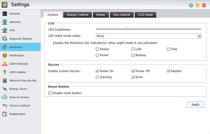 Secondly, we will take a look at the Hardware tab, as that is where we are able to control the majority of the hardware behind the ASUSTOR AS7004T. There are five tabs here, starting from left to right we have System, Energy Control, Power, Fan Control, and LCD Panel. The System tab gives the user to control the lights and sounds coming from the NAS itself. The LEDs can be turned on and off, and the brightness of the LED indicators can be set as well. It is also possible to disable the buzzer or system sounds from being heard. Finally, the reset button can also be disabled to prevent accidental resets. Under the Energy Control tab, the time before a drive goes into standby can be set. The ASUSTOR AS7004T can be sent to S3 mode if there is no data access within a given time period. The Power tab has a few settings to reduce the power usage on the AS7004T, including EuP mode and power scheduling. When it comes to Fan Control, there are four settings: Auto, Low speed, Medium speed, and High speed. The LCD Panel page allows you to output personalized text to the screen, which can be a user defined string, or local weather information. All of these can be found under the Hardware tab on the left side, and are pretty standard when it comes to options you would want to see on a NAS device.