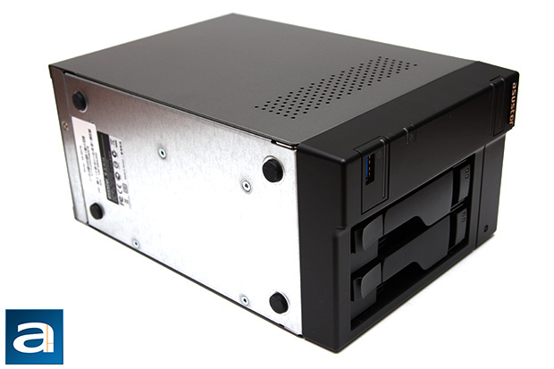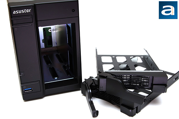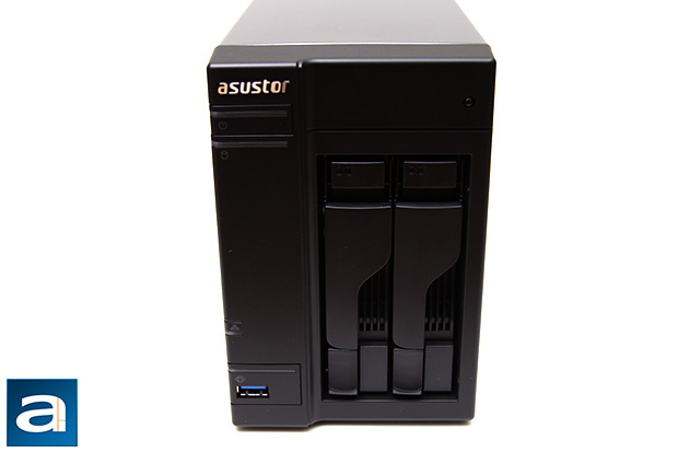 ASUSTOR, like QNAP, has their NAS design more focused on an industrial/datacenter appearance as aforementioned, and fundamentally, they are very similar. The AS-202TE features two prominent and easily accessible vertically mounted disk trays, which can be unlatched when the button is pushed. Once unlatched, you can slide out the drive tray. However, unlike QNAP's business class devices, the ASUSTOR AS-202TE does not have lockable drive trays, but this should not be a problem for home users. The ventilated disk trays provide excellent airflow over the hard drives driven by the rear mounted cooling fan inside the system. ASUSTOR's embossed logo is finished in brushed silver-colored metal, and placed near the top left corner; whereas a black, textured hard plastic surface occupies the rest of the front face.