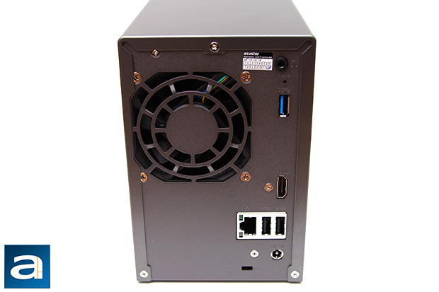 What we have at the back of the system is a simple array of connectors, but enough to pass as a media center device. Here, we have an HDMI port at the bottom right above the pair of USB ports, and a 3.5mm audio output at the top right corner. Unfortunately, there is no S/PDIF output; the only way to get digital audio from your ASUSTOR NAS is via HDMI passthrough, or if you hook up a compatible USB sound card. The rest of the connection array is quite standard; there is one USB 3.0 and two USB 2.0 ports. You can connect up to three printers simultaneously. One integrated Gigabit LAN port resides next to the USB ports. At the bottom right corner is a DC 12V input from the external power brick. Occupying a large chunk of space at the back is a single 70mm exhaust fan to pull heat out of your NAS server. Exhaust vents cut into the steel panel. In my opinion, a proper fan grille would have been better.
