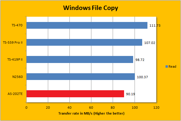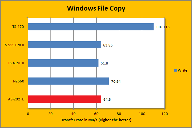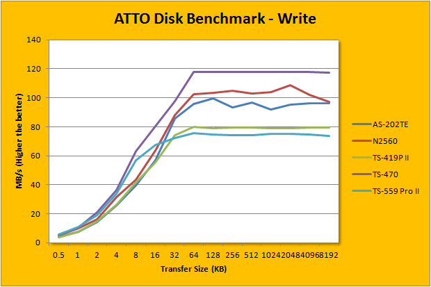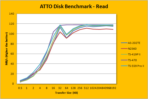 ATTO disk benchmark provides valuable insight into evaluating disk performance; it is especially valuable since it is not local disk limited like Windows file copy -- but rather the network adapter itself. After first using it in our QNAP TS-559 Pro+ review three years ago, ATTO has been an integral part of our storage benchmarks; used in everything ranging from USB flash drives to solid state disks. Venturing into the area of 115MB/s in read and 100MB/s write for pretty much everything 128K and up, remember that the theoretical maximum of Gigabit Ethernet is 'only' 125MB/s (1000Mbps / 8) with overhead -- this is pretty impressive. As far its comparison against the Thecus N2560 is concerned, it is slightly slower in the write portion like we have seen earlier. Interestingly, when it comes to the read portion, the ASUSTOR AS-202TE is actually faster. Does it make sense? Not really, but results are results.