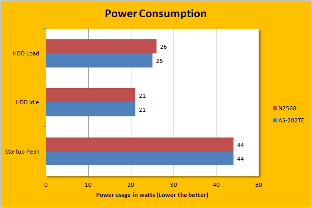 With one SSD and one hard drive installed, power consumption for our specific configuration is at a very reasonable 21W idling and 25W under load. Power consumption will drop even further if the hard drives are configured to turn off if they are not used. Just for your curiosity and reference, startup peak power usage is 44W. All in all, the ASUSTOR AS-202TE is quite a power efficient network attached storage. In fact, these figures are almost identical to the Thecus N2560, a NAS touted for its efficiency. Considering it is going to be running 24/7, every watt will definitely add up!