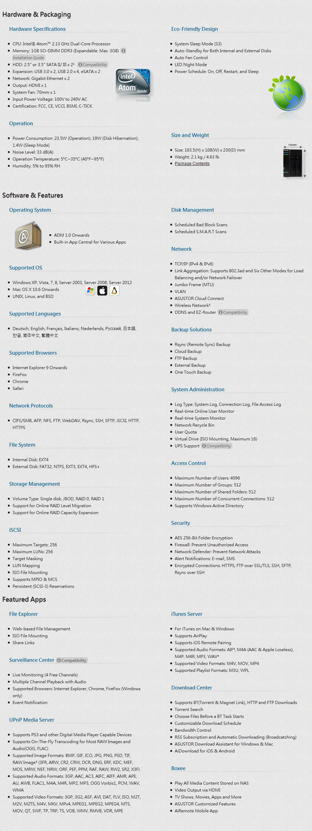 Before we move on, let's take a look at the specifications of the ASUSTOR AS-602T, as obtained from ASUSTOR's website.