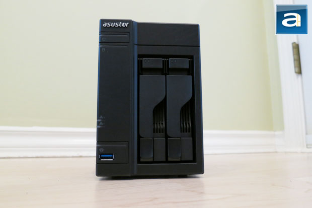 The ASUSTOR AS-602T looks fairly close to what one would expect a typical NAS device to look like. It looks quite similar to the QNAP TS-219P II, but that is probably due to the two hard drive slots in a top-down orientation more than anything. Your call. The front of the ASUSTOR AS-602T is made out of a black plastic. A fairly sizable ASUSTOR logo can be found at the top left, as shown in our photo above. Below the logo are two LEDs; the power LED and the storage LED. Located near the bottom left are two more blue LEDs that indicates the LAN connections at the back. Last but not least, we have a USB 3.0 port here that can be used for external storage devices. On the right, we have two removable storage trays, which are held on by a button/latch design that allows for easy access to the drives at any point. These trays can accommodate either 2.5” or 3.5" devices using the included screws and mounting holes.