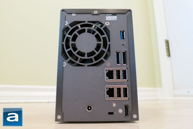 Looking at the back of the ASUSTOR AS-602T, we are greeted with a big surprise. At first, I thought I was imagining things, but after close inspection, I found there were actually quite a few ports at the back. Starting from the top left, we are greeted with a 70mm exhaust fan, which is the only form of cooling used for this network attached storage system. From the very top on the right, we have yet another USB 3.0 port for more external devices. Found below that are two eSATA ports for additional external storage devices. Two sets of Gigabit Ethernet ports and two USB 2.0 ports can be found underneath the eSATA ports aforementioned. Finally, we have probably the most surprising connector here, which is an HDMI port -- which would allow for external displays. That is probably the biggest benefit, meaning one can install their own set of OS or software on the NAS and even possibly use it for different purposes such as a HTPC and file server at the same time. An app called Boxee already allows you to do that. The possibilities are quite endless with the addition of an external display.