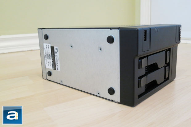 Turning over the device and revealing the bottom, we are not greeted with too much here. What we do see are the metal panels on the rest of the ASUSTOR AS-602T, which is constructed mostly out of SECC save for the front panel and drive tray latches. Four vibration stoppers can also be found here to reduce vibrations and sliding of the device on smooth surfaces.
