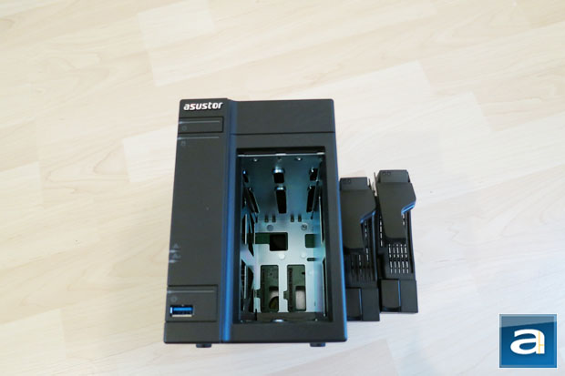 Removing the two vertically mounted 3.5" drive trays, we are partially shown the internals of the ASUSTOR AS-602T. We can see from this that the two drives are supported by a mounted daughterboard at the back controlled by a SATA controller independent of the device. The trays here are very easy to use, as you just need to pull on a latch and slide out the trays, making for easy removal and installation. As with all other SATA systems, hard drives are hot swappable and can easily be replaced. Each of these trays can have either a 3.5" or 2.5" device installed using the included screwed as aforementioned. The ASUSTOR AS-602T supports Single disk, JBOD (Linear Disk Volume), RAID 0 (Disk Striping), and RAID 1 (Disk Mirroring). The ASUSTOR AS-602T also supports AES 256-Bit Folder Encryption for anyone that needs the added security features of encryption.