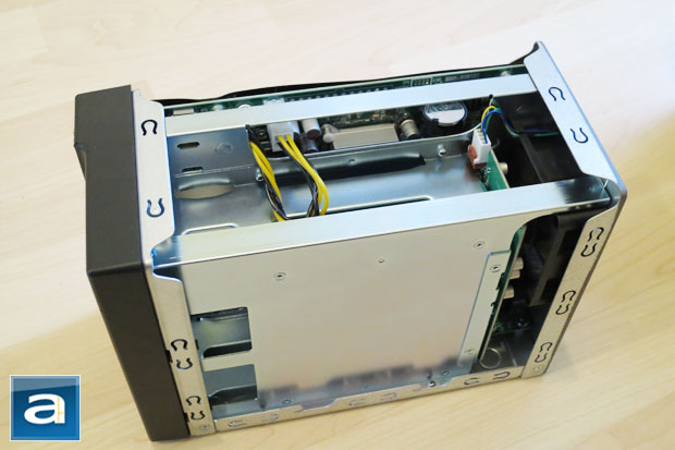 Three Phillip-head screws can also be found around the NAS here at the back, with one at the bottom right and bottom left corners, respectively; with the last one located top and center on the shell. Removing these screws gives one insight about the interior of this ASUSTOR device, we will take a look at the internals in a bit.