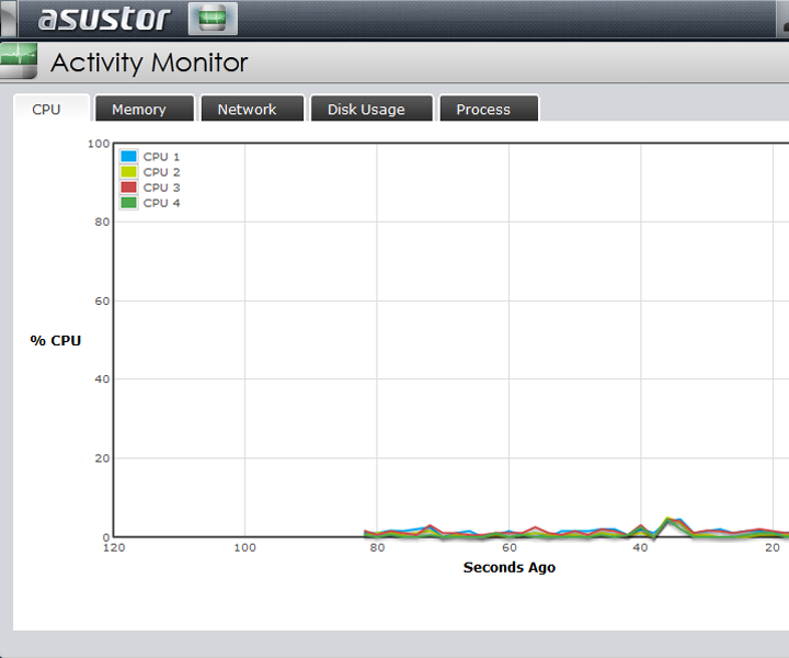 Another useful application found on the ASUSTOR AS-602T is the Activity Monitor application, which is used to keep track of the load on the NAS device. There are a total of five tabs here that tracks different things, including CPU, Memory, Network, Disk Usage, and Process. All of these combined give a good look at the performance of the device at any given time from utilization. The first tab keeps track of CPU usage from CPU 1 to CPU 4 (Remember, Hyper Threading), and all of them are listed on a dynamically updating line graph. In Memory, the usage of memory in percentage is kept track of with a line graph as well. The right side also lists the total amount of physical memory, amount of memory used, and the amount of memory available. Network usage keeps track of the network usage in KB/s sent and received from the two LAN ports. Disk Usage has a pie graph that shows the amount of space being used, amount free, and other applications that may be using the disk. Lastly, Process lists the number of processes running on the NAS, as well as the memory usage and the CPU usage of each process.
