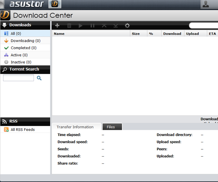 Next, we will take a look at the Download Center application, which is basically a download manager based on the NAS. The interface here is pretty intuitive, and what you would expect to see from your average download manager. The left side shows all the different stages of download -- such as downloading, completed, active, and inactive. Below it is the torrent search function, further down, we have a section to add RSS feeds for the latest torrents. I must admit the latter can be quite useful for downloading things that update frequently, such as podcasts or other live streaming shows later put into torrent form. The main download area has a few buttons at the top to add, stop, start, pause, move up, move down, and settings for different tasks. In terms of downloads, there is support for torrents, HTTP/FTP URLs, Thunder, FlashGET, and QQDL. With all this in one package, I can safely say that if I were to want to use my NAS as a download server, this would be a great way to do so. The fact this support is built into the application is great, and says a lot about the dedication ASUSTOR put into their applications.