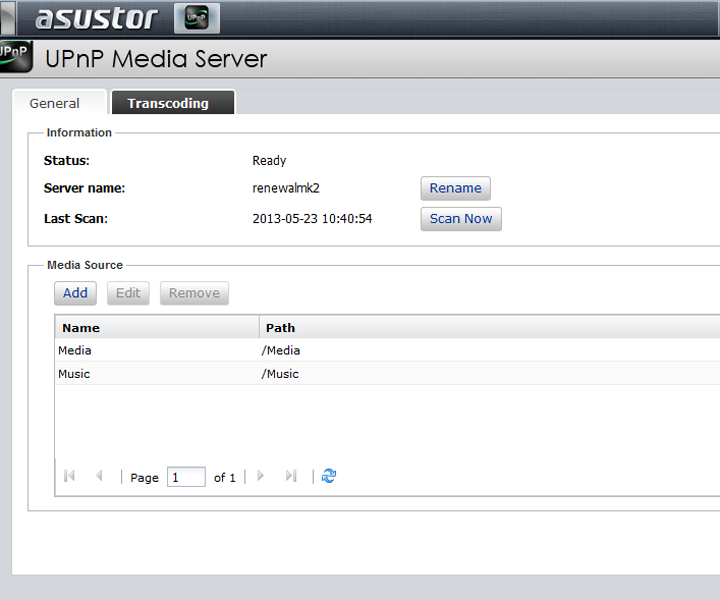 Our first application we will take a look at from the App Central is the UPnP Media Server or Universal Plug and Play Media Server. UPnP is a set of online networking protocols used to allows devices to discover each other on the network. This can range from mobile devices, printers, and of course, other personal computers. In the UPnP Media Server application, there are only two tabs; one being General, and the other being Transcoding. Under the General tab, there is a small box at the top with information, which includes the status, server name, and last scan. Below that, we have the media source area, where one can add, edit, and remove folders that get shared over the network. Under the Transcoding tab, there are only two check boxes, one for audio, and one for images. Checking these boxes will share these type of files from the earlier selected folders over the network for real-time transcoding.