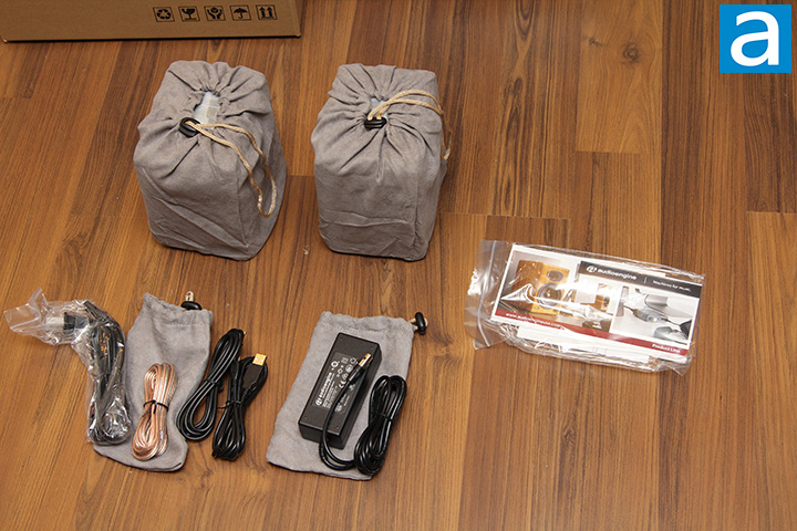 Out of the box, you will receive everything you need to get you started. In addition to the Styrofoam brackets, you will also find both speakers, cables, and power supply all come in a reusable microfiber drawstring bag. I think the way a product is packaged is a statement in itself to the end user, and my experience with stuff from Audioengine in the past -- namely, the A2+, B2, HD3, and HD6 -- is the company makes its products with no expenses spared. We will dig into that more in the hardware inspection on the next page, but for now, here is a list of what you will receive in addition to the Audioengine A2+ Wireless speakers itself:
