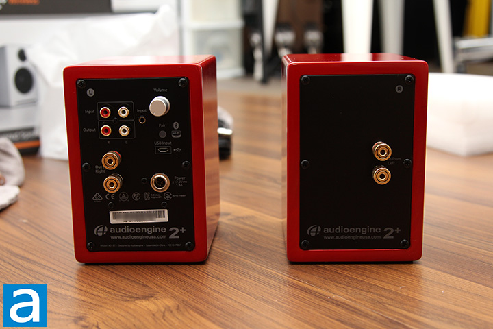 Here is a shot at the back of the Audioengine A2+ Wireless powered desktop speakers. By "powered", it means it comes with an internal amplifier. What we have here is a dual class AB monolithic amplifier located inside the left speaker -- shown on the right, as you can see in our photo above -- that provides 15W RMS and 30W peak per channel. As such, the left speaker weighs almost half a pound more than the right; where Audioengine specifies a weight of 3.55lbs and 3.15lbs, respectively. Power is supplied by an external brick.