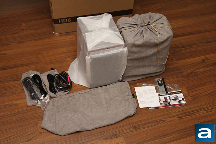 Out of the box, you will receive everything you need to get you started. In addition to the Styrofoam brackets, you will find both speakers and cables all come in their separate reusable microfiber drawstring bag. I think the way a product is packaged is a statement in itself to the end user, and my experience with stuff from Audioengine in the past -- namely, the A2+ and B2 -- is the company makes its products with no expenses spared. We will dig into that more in the hardware inspection on the next page, but for now, here is a list of what you will receive in addition to the Audioengine HD6 speakers itself: