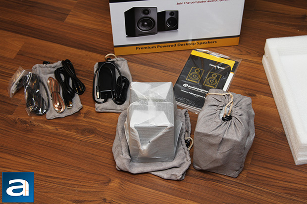 Out of the box, you will receive everything you need to get you started. In addition to the Styrofoam brackets, you will also find both speakers, cables, and power supply all come in a reusable microfiber drawstring bag. I have to say, that is pretty classy, haha. With that in mind, here is a list of what you will receive in addition to the Audioengine A2+ speakers itself: