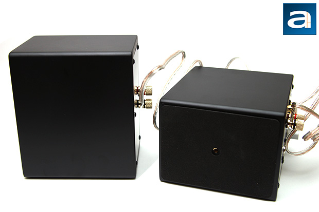 From the front, both the left and right speakers look identical. At the bottom is a 2.75" Kevlar woven glass aramid composite woofer with rubber surrounds, and at the top is a 0.75” ferro fluid cooled silk dome tweeter with neodymium magnets. Together, their frequency response is rated at 65Hz-22kHz ±2.0dB, but despite its studio monitor looks, do not expect flat response all the way down to 65Hz. We will talk about that in our evaluation on the next page. The use of high end materials for construction allows reduced distortion at high volumes, and Audioengine says it alleviates the need for speaker grilles as well. That said, it will still be wise to keep your three year old kid away from your $250 speakers in my opinion, haha. Signal to noise ratio is specified at 95dB, THD+N at 0.05%, and -50dB stereo crosstalk. One major complaint I have is Audioengine did not include any front audio controls for the A2+. The volume control knob is at the back, which is quite unintuitive. I agree it makes the speakers compact, good looking, and symmetrical, but you will have to sacrifice some functionality for that.