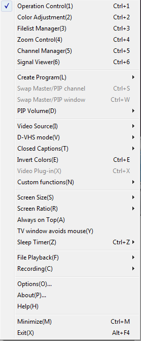 Right clicking the TV display window brings up a plethora of options within a single menu.