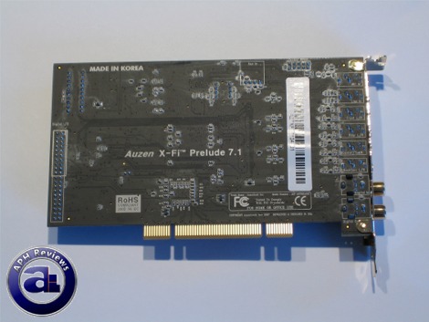 Flipping the Auzentech X-Fi Prelude PCI sound card on its back reveals sharp "Auzen X-Fi Prelude 7.1" towards the middle of the board, along with several other things such as a ROHS compliancy logo and, surprisingly, "Made in Korea"!