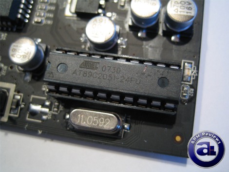 Atmel's AT89C2051 CMOS controller chip is used on the X-Fi Prelude. It is an 8051-based, fully static chip that operates at 24MHz. Other features include 15 I/O lines, 2 timers/counters, 6 interrupts/2 priority levels, analog comparator, LED drive outputs, UART, two-level program memory lock, 2KB flash memory, as well as 128 bytes on-chip random access memory.