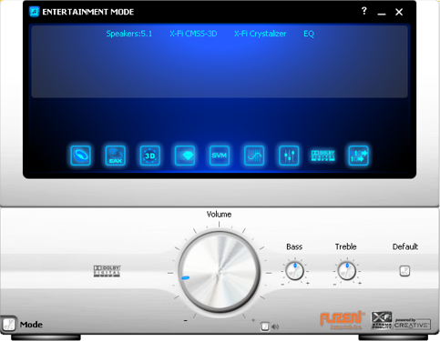 The main screen of the drivers set into Entertainment Mode on the Auzentech X-Fi Prelude. Besides the Creative logo replaced by the Auzentech logo in the bottom right corner, it's pretty much the same thing as Creative's own drivers in terms of user interface. The volume control is located in the middle at the bottom section; to the right of it are two virtual knobs for treble and bass control. At the top is an array of nine icons to bring in submenus to configure various settings available on the X-Fi Prelude.