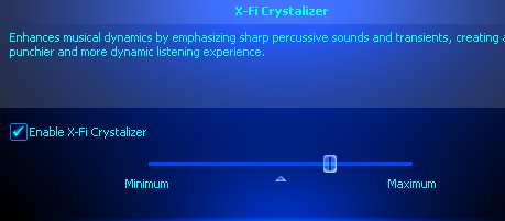 As far as an X-Fi goes, certainly the Creative X-Fi Crystalizer is part of the package. Working off the Creative DSP/APU, it is basically a dynamic equalizer/multi-band compressor to improve perceived audio quality -- it makes the highs and lows more apparent to the listener in order to make the audio sound more punchy. While it will not make low quality MP3s 'sound better than the original', it's still certainly a nice feature to have. It has been criticized by audiophiles that dislike the idea of manipulating the original signal and limit the intended sound, this is purely based on each individual and the music played back. Generally, users who like 'punchy' and more colorful sound will definitely appreciate this feature and its effect.