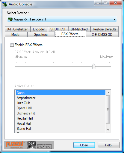 In the Auzentech Audio Console, again it looks almost identical to the Creative Audio Console in terms of looks; with a few proprietary Auzentech X-Fi Prelude only features that's not in Creative's own drivers. This is basically a non-fancy-GUI configuration control; pretty much all of the configurable items in here can be done in the GUI console as in the previous screenshots.