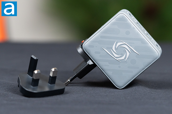 The plug on the AVerMedia Elite Go GC313Pro is located at the bottom, and can be folded to prevent it from protruding when being carried around. It is a US standard plug, but AVerMedia has included adapters for both UK and EU standard plugs. It has universal AC power input of 100V to 240V and 50Hz to 60Hz, which means it will automatically adjust for the voltages and frequencies of different places in the world like the Core Go. The adapters are fitted onto the plug in the folded position with a clip to secure it in place.