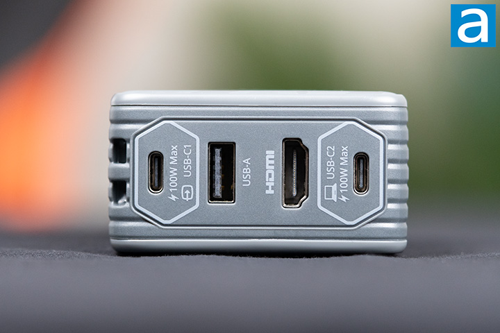 The interfaces of the Elite Go are located on the top. There are two USB Type-C, one HDMI, and one USB Type-A port. Both Type-C are version 3.2 Gen 1, unlike the Core Go, which has 3.2 Gen 1 and 2.0. By using the USB-C1 port, the wall charger can function as a dock for the host device connected to it. The HDMI port can be used to connect to a display, while the USB Type-A can be used to connect peripherals. The USB-C2 port can be used to connect to a computer to receive data for the capture card functionality of the Elite Go. All USB ports can be used to charge at the same time, but the USB Type-C max power output will vary. If a single Type-C device is connected, the max output will be 100W, but when two are connected, the max output of each is 45W. The Type-A port will always have a max output of 5W. These charging capabilities match the Core Go.