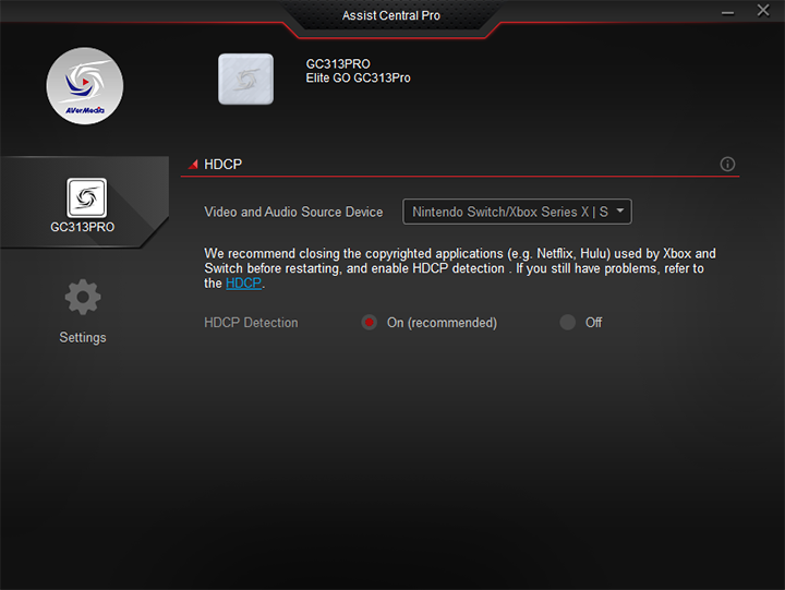 Through the Assist Central Pro software from AVerMedia, the Elite Go firmware can be updated as well as configuring settings for capturing footage from a handheld gaming device. Unlike other AVerMedia capture cards, the AVerMedia Streaming Center software does not support the Elite Go, so third-party software must be used for recording.