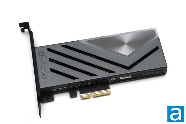 The AVerMedia Live Gamer 4K 2.1 GC575 definitely looks a lot more premium, especially when you compare it to the exposed printed circuit board of the AVerMedia Live Streamer Ultra HD GC571. This PCI Express-based capture card is covered with a metal enclosure. However, most of this enclosure does not make contact with any of the physical components on the board. This metal is a gunmetal gray with AVerMedia's logo engraved near the back end. There are multiple slits throughout the body to also allow air to flow in and out. At the other end, we have an addressable RGB area that you can customize in software. This is a translucent plastic with a circular metal pattern here. I do like the concentric circle pattern for a contrasting but pleasing look.