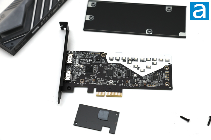 In order to dig a bit deeper, I opened up the AVerMedia Live Gamer 4K 2.1 GC575. While there is no warranty seal or anything of the sort, I would not recommend opening up this card. There are also no user-replaceable parts inside, so it is unnecessary to do so. If you want to do this, you can start by removing the four screws on the back. Afterwards, both sides pop off. One smaller internal heatsink exists over two primary components with a thermal pad on top of one of the components. This includes a Realtek RTD2801VPF SoC, which handles the decoding and processing of the input. The other is an ASMedia ASM3142, which is likely used as a bridge between the PCIe interface and the SoC. Around this side, we have a few more components, including the Winbond W25X40CL and W25Q64JV, which are both flash memory parts. There is an FE1.1s USB 2.0 hub controller and a Nuvoton NuMicro M032SE3AE microcontroller. Finally, you can see fifteen individual RGB LEDs designed to shine through the diffusion plate.