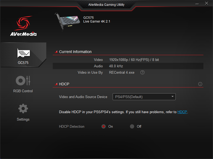 AVerMedia provides two software utilities to use with the GC575. Both can be downloaded from AVerMedia's website. The first software utility is called Gaming Utility, and the download is 33MB in size. This software is made primarily to check the status of the connected capture card. These menus show the current status of what is connected, including the video and audio output, as well as if it is being used by any other software application. In this case, I had my Nintendo Switch attached. Here, you can enable or disable HDCP as well. Under RGB Control, you can change the lighting effects to different static or dynamic modes. You can also select here to synchronize with your motherboard software. Under Settings, you can find options to update the firmware on the capture card and update the software utility itself. You can also change the input and output between HDMI 1.4, 2.0, or 2.1. As a note, you will need to change to HDMI 2.0 for 4K 30fps capture with RGB24 video format. Otherwise, the Gaming Utility is made more for status and updates rather than using the AVerMedia Live Gamer 4K 2.1 GC575.