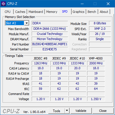 A screenshot of the memory tab in CPU-Z with the Ballistix Elite DDR4-4000 2x8GB installed. The SPD timings in CPU-Z reads standard JEDEC specifications programmed into the memory, as well as Intel XMP data for running the memory at various speeds. Using the latest BIOS revision, our ASUS Prime X470-Pro had no issues detecting and working with the Ballistix RAM out of the box. It should be noted, you may need to enter your BIOS to ensure the XMP profiles are active. The Ballistix Elite DDR4-4000 2x8GB retails for approximately $208 USD at press time.
